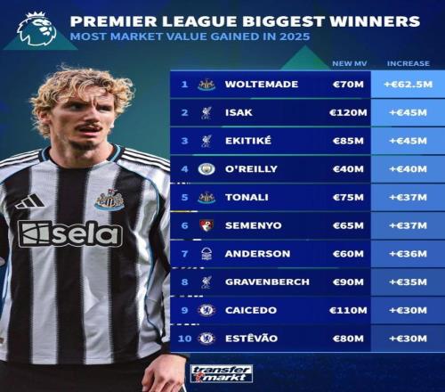 北京時間12月25日,德轉(zhuǎn)列出了英超球員中2025年漲幅最高的10名球員,今夏加盟紐卡斯?fàn)柭?lián)的沃爾特馬德過去這一年里身價暴漲6250萬歐元高居第一,伊薩克和?;倏松蠞q4500萬歐元并列第二。