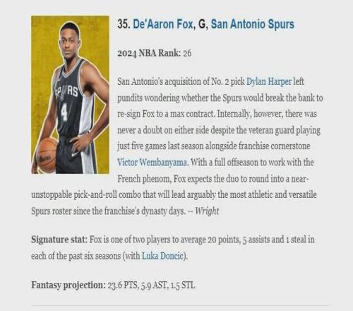 在賽季初ESPN評(píng)選的NBA2025-26百大球星中,??怂古琶?5(2024-25賽季排名第26),排名略有下降,網(wǎng)站評(píng)語如下:圣安東尼奧馬刺隊(duì)用榜眼秀選中迪倫-哈珀后,人們紛紛猜測(cè)馬刺隊(duì)是否會(huì)與??怂估m(xù)簽頂薪合同,盡管這位老將上賽季與球隊(duì)基石溫班亞馬僅搭檔出戰(zhàn)五場比賽,但馬刺內(nèi)部對(duì)此毫無顧慮,福克斯休賽期都在與這位法國天才磨合,期待二人能夠組成近乎無敵的擋拆組合,帶領(lǐng)馬刺打出自GDP王朝之后最具運(yùn)動(dòng)天賦和全面性的陣容。
