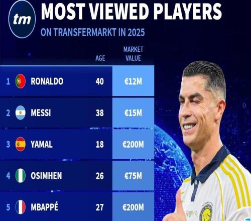 德轉(zhuǎn)2025年度球員瀏覽量排名:C羅第1,梅西第2,亞馬爾第3