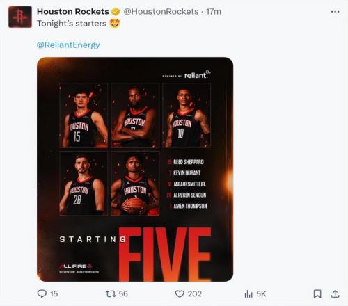 杜蘭特迎來火箭首秀進(jìn)入先發(fā)陣容,謝潑德依舊是先發(fā)一號位。