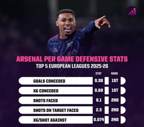 數(shù)據(jù)統(tǒng)計(jì)顯示,阿森納本賽季5項(xiàng)防守端關(guān)鍵數(shù)據(jù)均位列英超前二: