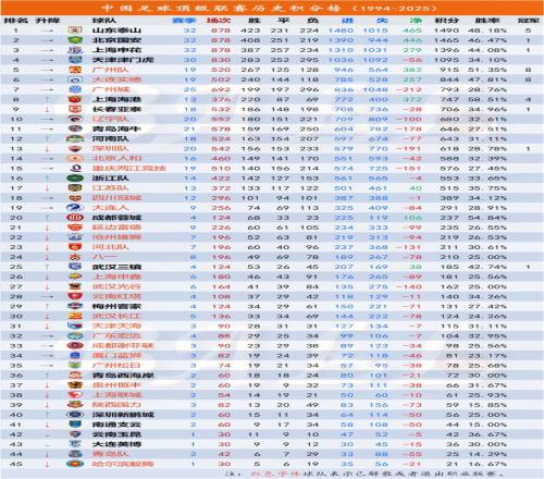 1、 統(tǒng)計(jì)數(shù)據(jù)自1994賽季至2025賽季,合計(jì)32年,不分甲A和中超。1994賽季采用2分制,其余賽季均為3分制。