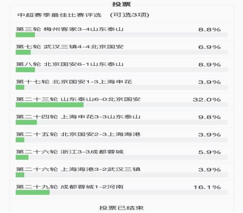2025中超最佳比賽正式出爐!賽季第23輪,山東泰山在濟南奧體中心6-0復仇北京國安的比賽以32.0%的得票率成功當選。