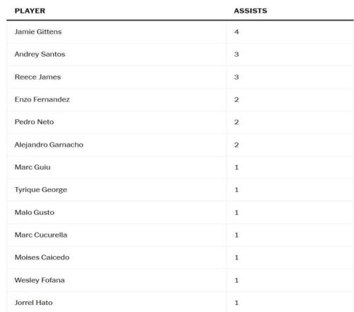 帕爾默的創(chuàng)造力也是難以替代的,雖然助攻并不是衡量這方面能力的唯一指標(biāo),但仍然值得注意,在這同樣的13場(chǎng)比賽中,有13名不同的球員至少貢獻(xiàn)了一次助攻。