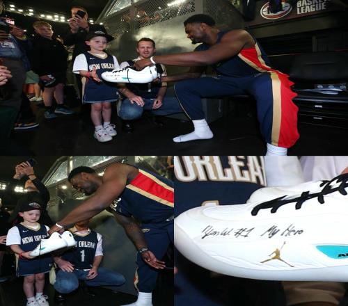 雷速體育10月5日訊 今日進(jìn)行的NBA季前賽,鵜鶘127-92輕取東南墨爾本鳳凰。賽后,據(jù)鵜鶘官方報(bào)道:球隊(duì)核心球星錫安向一位剛剛戰(zhàn)勝了癌癥的小朋友贈(zèng)送了自己的親簽球鞋,并寫(xiě)上"你